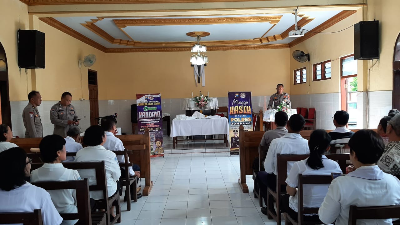 JOMBANG| NUSANTARA POS COM|| Polres Jombang rutin mendatangi gereja atau rumah ibadah umat Kristen setiap minggunya. Upaya tersebut untuk menjaga toleransi serta berikan rasa aman dan nyaman dalam menjalankan ibadah.