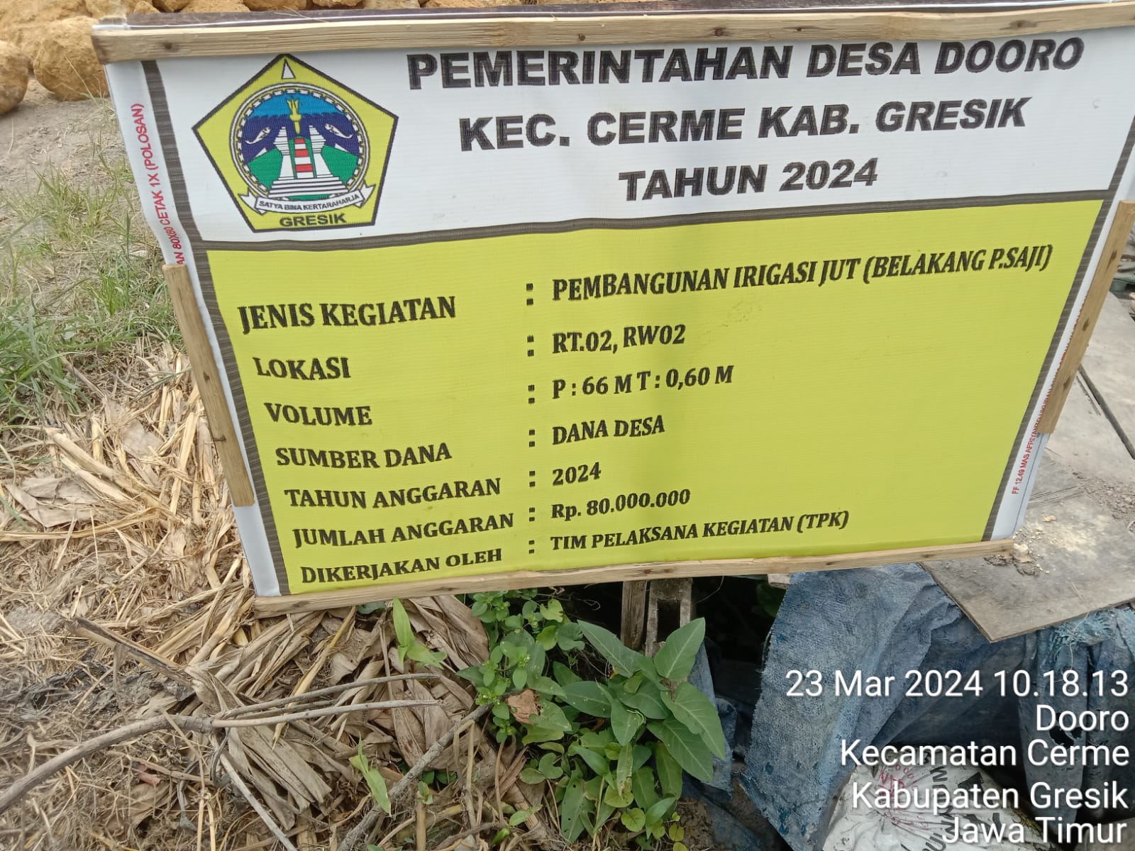 Kegiatan yang bersumber dana dari APBDes tahun 2024 ( Dana Desa ) senilai Rp. 80,000.000 dengan volume Panjang 66 Meter, 0,60 Meter,yang berlokasi di RT 02,RW 02.desa Dooro.