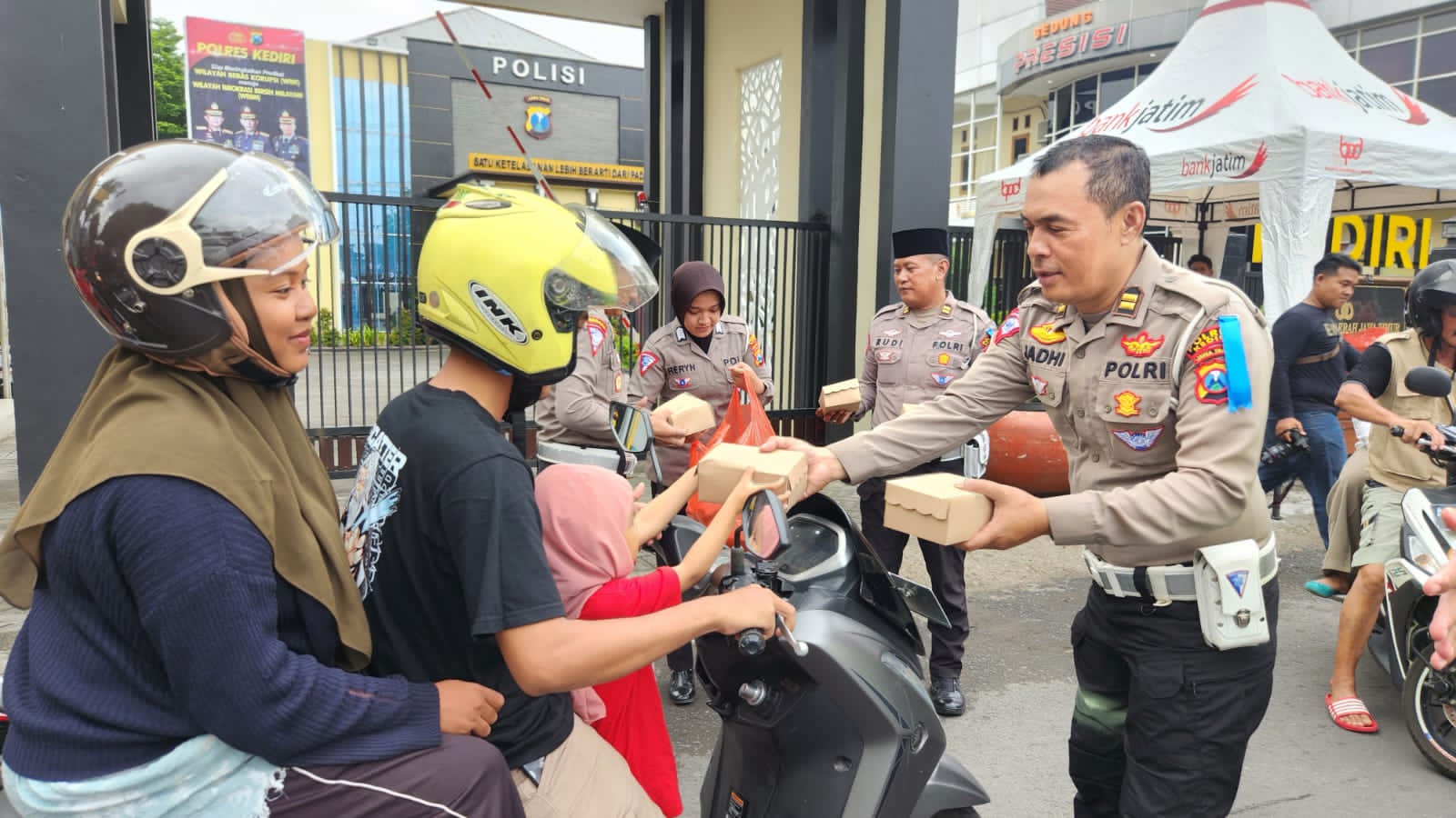 “Hari ini kami dari Satlantas polres Kediri membagikan takjil gratis kepada pengguna jalan sebagai bentuk syukur kami kepada Allah SWT karena masih dipertemukan dengan bulan Ramadan dan semoga apa yang kami lakukan menjadi berkah memberi manfaat yang baik bagi diri kami dan masyarakat, karena dengan berbagi hidup menjadi lebih berarti. Terang Kasat Lantas Polres Kediri.