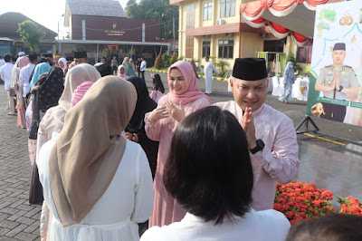 Setelah selesai melaksanakan Sholat Idul Fitri 1445 H, AKBP Teddy Chandra memanfaatkan waktunya untuk melakukan halal Bihalal dan saling memaafkan di halaman Sarja Arya Racana Polres Pasuruan dengan keluarga besar Polres Pasuruan yang ikut hadir shalat Idul Fitri 1445 H.