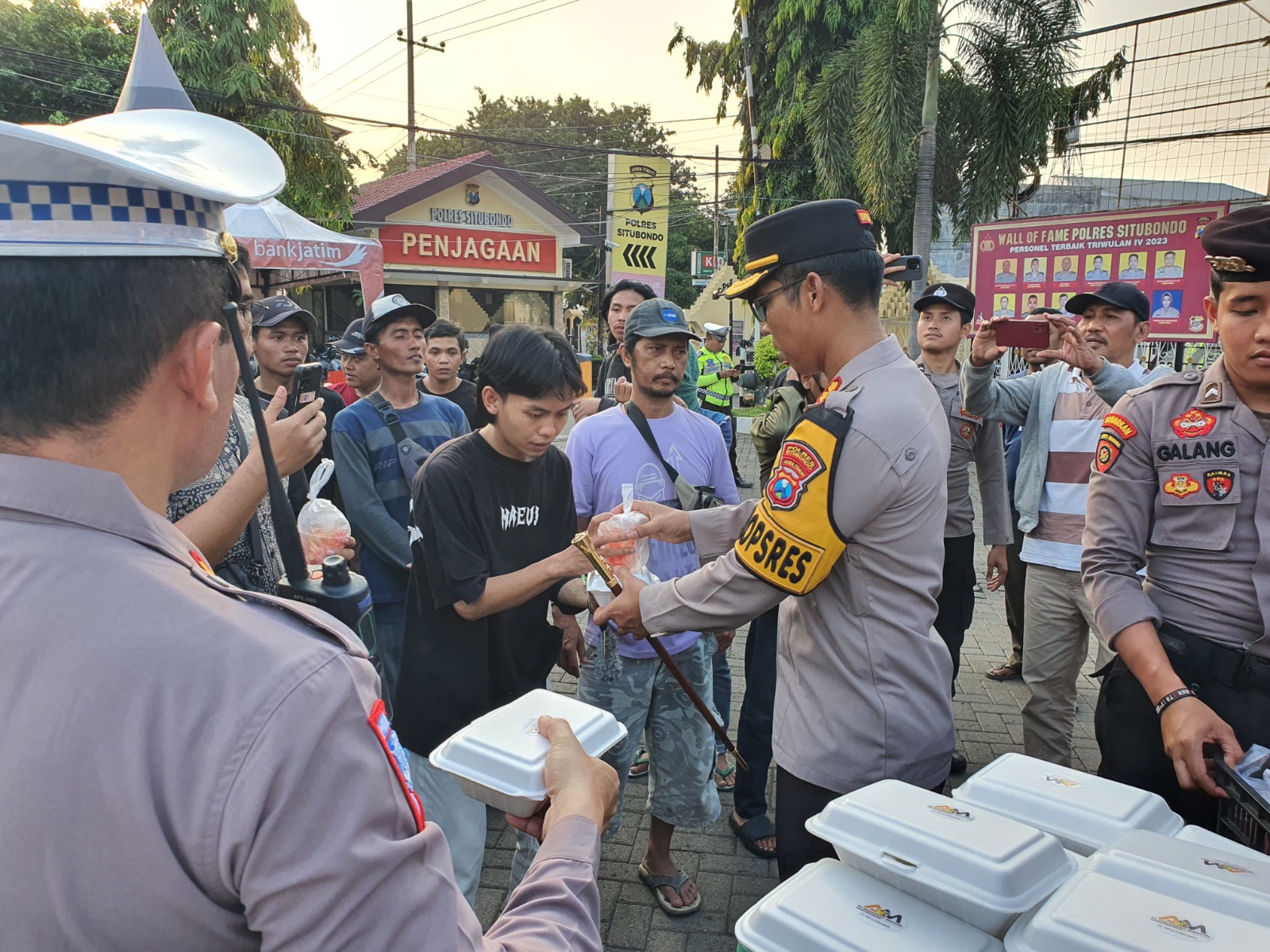 Kapolres Situbondo AKBP Dwi Sumrahadi Rakhmanto, S.H., S.I.K., M.H. membagikan takjil kepada massa pengunjuk rasa dari Aliansi Masyarakat Peduli Demokrasi (AMPD) Kabupaten Situbondo.