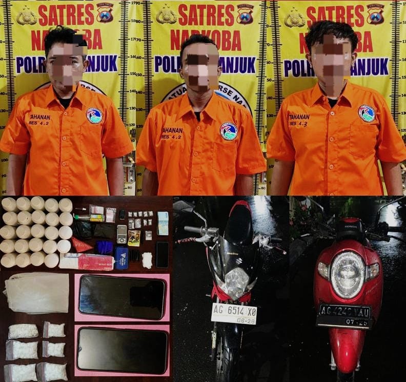 “Pengembangan lebih lanjut mengarah ke MI, MF, dan WA. Mereka ditangkap di rumah kontrakan di Kecamatan Loceret bersama barang bukti sabu, alat hisap, serta ribuan pil dobel L yang disimpan di berbagai tempat,” ungkap IPTU Sugiarto.