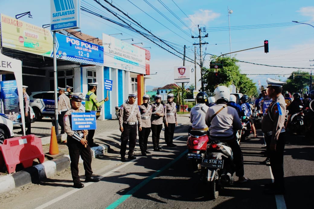 Memanfaatkan momen istimewa itu, Satuan Lalu Lintas Polres Trenggalek Polda Jatim menggelar sosialisasi tertib berlalu lintas kepada para pengguna jalan tepatnya di simpang tiga Widowati, Kabupaten Trenggalek.