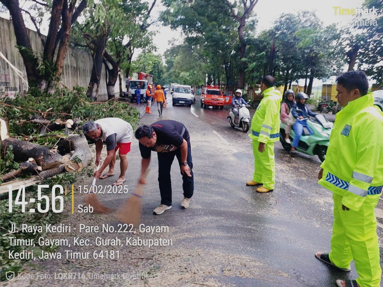 Personel Polsek Gurah Polres Kediri turun tangan membantu evakuasi pohon tumbang yang menghalangi sebagian badan jalan di pinggiran jalan raya, Sabtu (15/2/2025) sore.