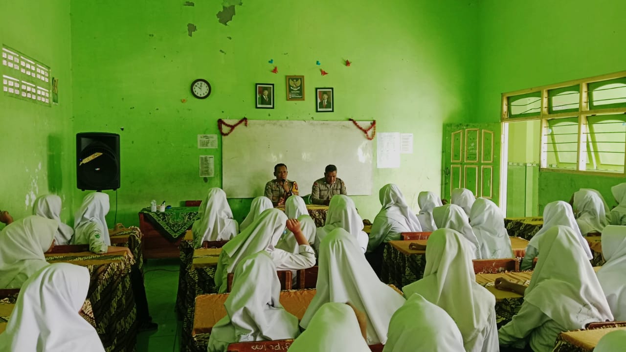 Anggota Satbinmas Polres Kediri menggelar penyuluhan mengenai kampanye Stop Bullying, bahaya narkoba, serta sosialisasi Operasi Keselamatan Semeru 2025 di MTS Maarif Pare, Senin (17/2/2025).