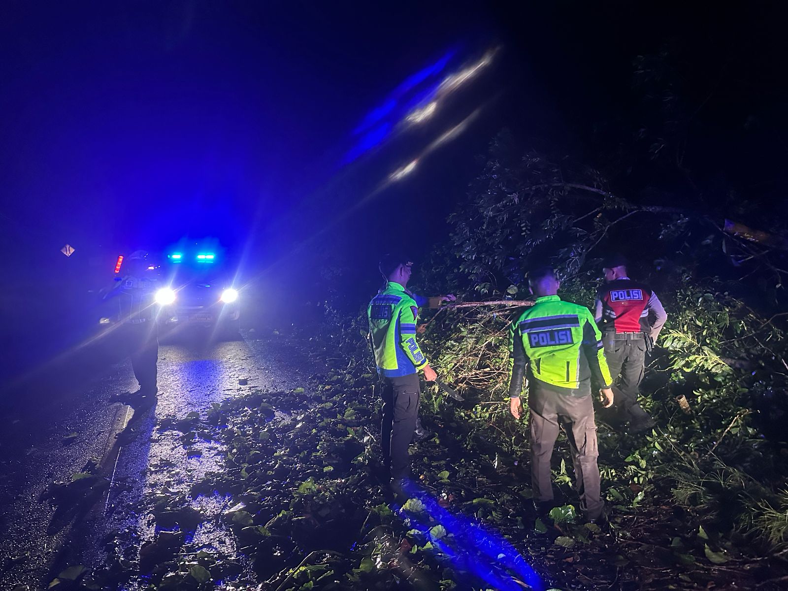 @misran@Mesuji //Nusantara -post.comDemi kelancaran lalulintas dan kenyamanan serta keamanan para pengguna jalan, Jajaran Sat Lantas bersama Sat Samapta Polres Mesuji membersihkan pohon tumbang yang menghalangi jalan akibat hujan deras disertai angin kencang yang berada di Jalan Lintas Timur KM 185 pada Hari Selasa Tanggal 18 Februari 2025 Malam.