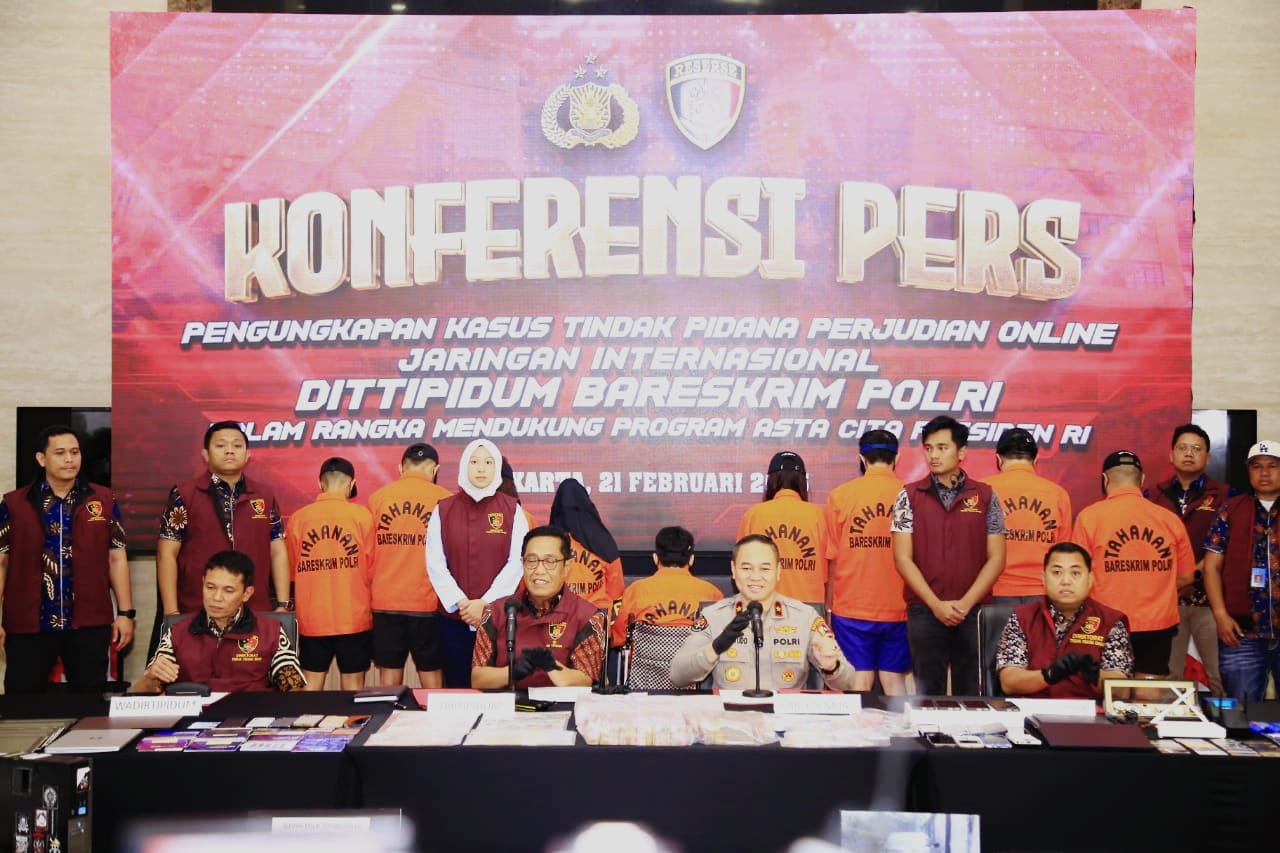 Penyidik Bareskrim Polri mengungkap tindak pidana perdagangan orang (TPPO) dan judi online. Jaringan ini terhubung dengan server di China, Filipina, Kamboja, Vietnam, dan Thailand.