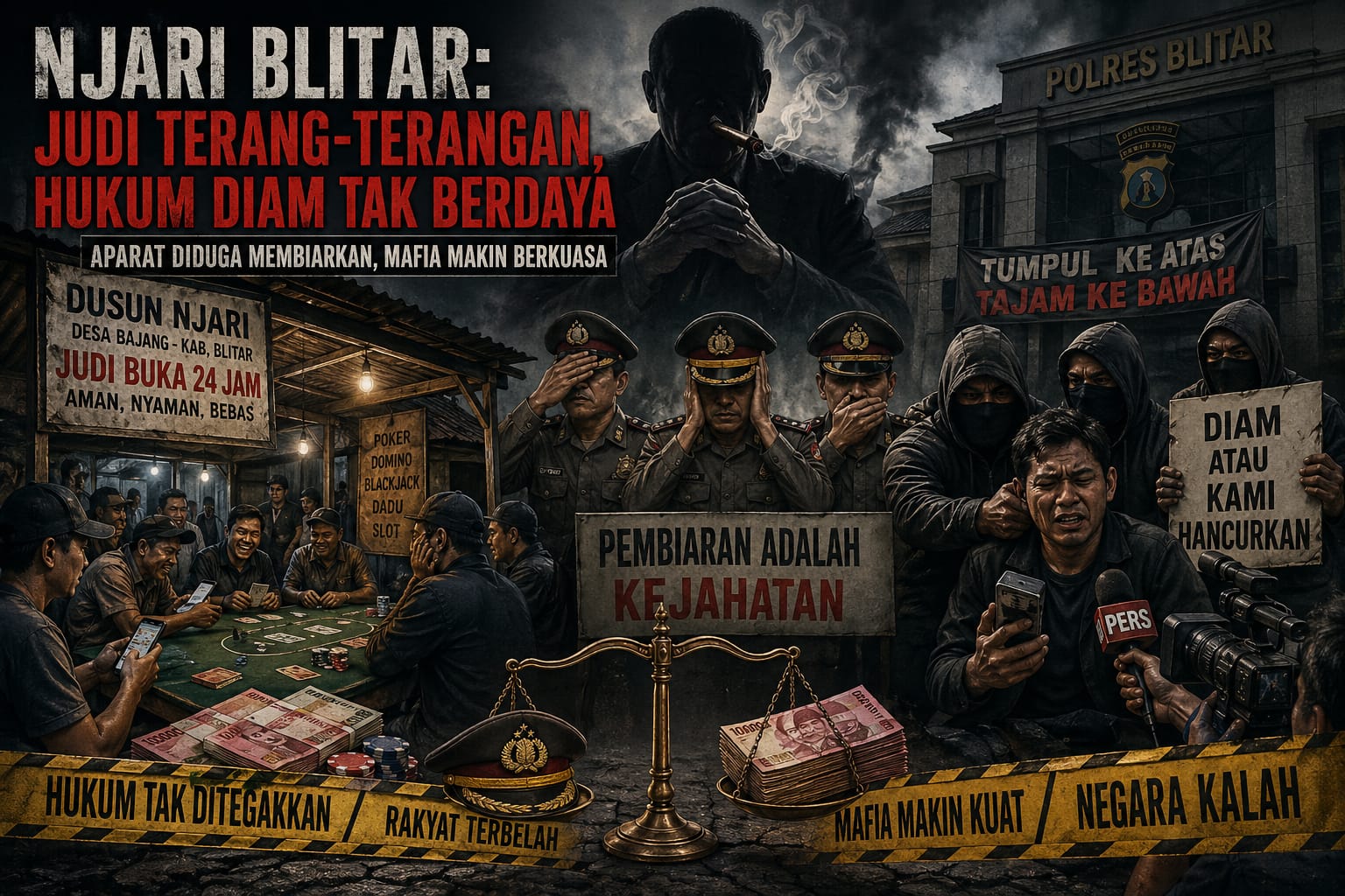BLITAR. Nusantara Pos.Praktik perjudian di Dusun Njari, Desa Bajang, Kabupaten Blitar, kini bukan lagi sekadar persoalan hukum biasa. Ia telah berubah menjadi potret buram tentang bagaimana hukum dipertontonkan kalah oleh keberanian pelanggar, dan lebih mengkhawatirkan oleh dugaan pembiaran aparat penegak hukum yang seolah kehilangan taringnya sendiri.